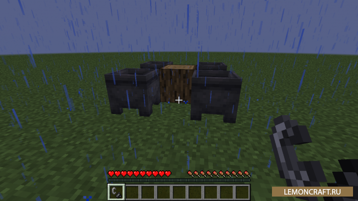 Мод на управление дождем Rain Be Gone Ritual добавляет в игру возможность влиять на поведение дождя с помощью специальных ритуалов, и при этом пополнить ваши запасы водой. Для проведения ритуала вам понадобится котел, бревно и огниво.